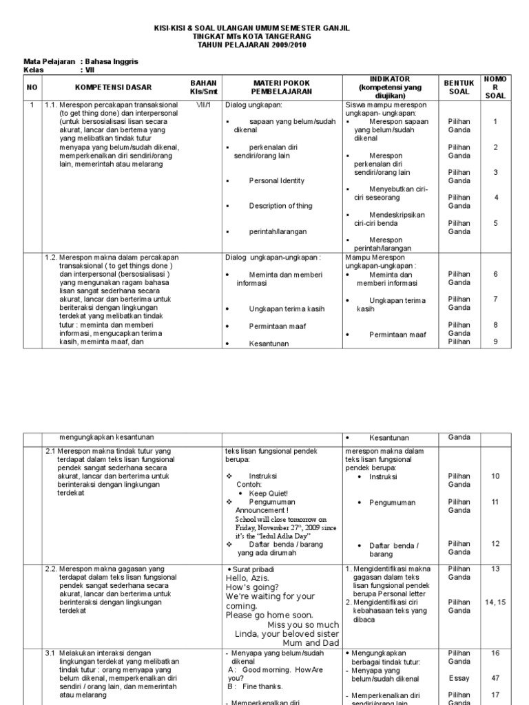 Soal Ulangan Harian Bahasa Inggris Kelas 7 Chapter 2 Masnurul from image.slidesharecdn.com >>>>soal dan jawaban bahasa indonesia kelas 7 smp semester 2. Jan 12, 2015 · soal uas bahasa sunda semester 2 ini mulai dari kelas 1 , kelas 2, kelas 3 , kelas 4 kelas 5 dan kelas 6 : Mar 03, 2021 · inilah pembahasan soal dan jawaban latihan uts dan pts untuk siswa kelas 7 smp/ mts pelajaran bahasa indonesia dilansir dari bospedia.com: Selain itu, bagi guru agama islam, soal yang ada dapat dijadikan contoh dalam pembuatan soal ulangan harian, latihan soal, soal uas/pat, perbendaharaan soal/bank soal, dan lain sebagainya. Bank soal atau kumpulan soal ini berisi tentang soal uh (ulangan harian), uts (ulangan tengah semester), uas (ulangan akhir semester), ukk (ulangan kenaikan kelas), un (ujian nasional) yang sengaja kami berikan secara gratis. Nov 16, 2020 · karena biasanya soal ips kelas 7 semester 2 2020 yang akan diujikan tidak jauh berbeda dengan soal tahun sebelumnya. 20 contoh soal pg bahasa inggris. Bagi guru mapel b.inggris semoga bisa menjadi referensi dalam pembuatan soal ulangan/ujian ataupun bisa juga dijadikan bank soal.