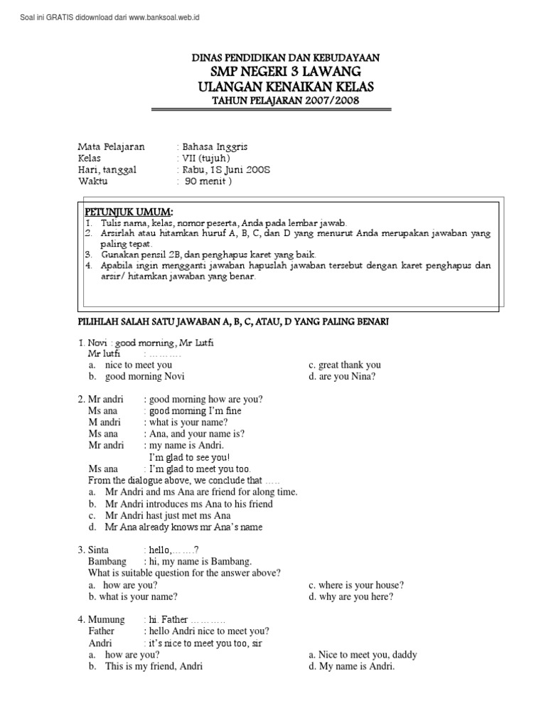 / Soal Ulangan Harian Bahasa Inggris Kelas 7 Semester 1 / Contoh Soal Essay Bahasa Inggris Kelas 7 Kurikulum 2013 Dapatkan Contoh / 20 contoh soal pg bahasa inggris.