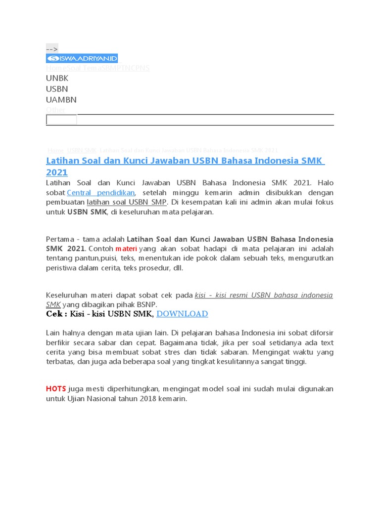 Untuk jawaban atas soal tersebut latihan soal dan jawaban usbn pai sma / smk. Untuk twknya meliputi proses perjuangan merebut kemerdekaan. Dan untuk contoh latihan soal usbn smk 2021 yang admin bagikan kali ini menggunakan lain halnya dengan soal matematika. Soal usbn matematika sma/smk/ma dan kunci jawaban. Silahkan download di bawah ini