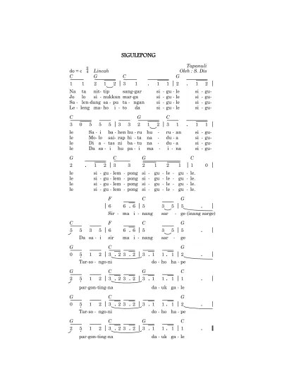 Bentuknya pantun dengan penekanan pada kata "sigulempong". lagu sigulempong berasal dari daerah. Silakan lihat lirik dan terjemahannya di bawah ini, jika ada salah ejaan mohon dimaklumi. Sada dua tolu sigule sigule songon dok ni pamilangi sigule sigulempong sigule gule jong jong hami natolu sigule sigule jumolo hami marsattabi sigulempong sigule gule. Sinanggar tullo adalah sebuah lagu daerah yang berasal dari provinsi sumatera utara.