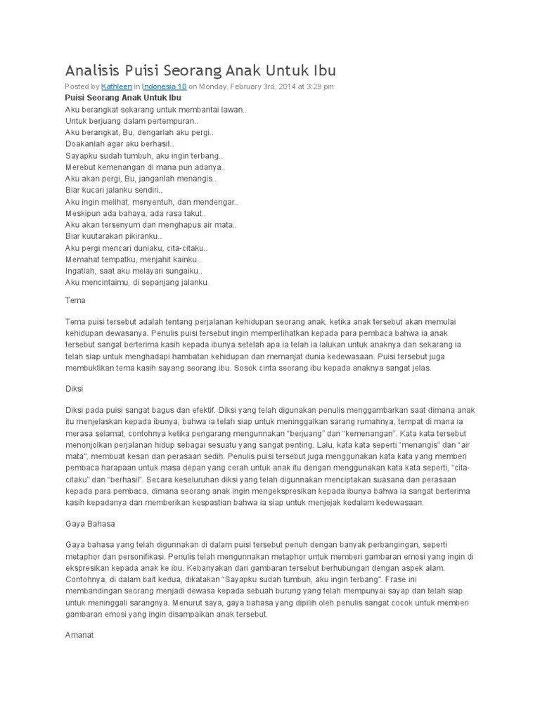 Rasa (feeling), yaitu sikap penyair terhadap pokok permasalahan yang terdapat … Dijelaskan bahwa saat kecil anak tersebut diasuh dengan penuh kasih sayang, dicukupi segala kebutuhannya, dan selalu ada di saat anaknya butuh. Memang sejuta rangkaian kata puitis yang kita berikan tidak akan pernah sebanding dengan perngorbanan ayah dan ibu kita. (b) perbezaan darjat menyebabkan impian seseorang itu terhalang. Persoalan (a) perwatakan yang menarik akan menyebabkan diri disukai oleh ramai orang.